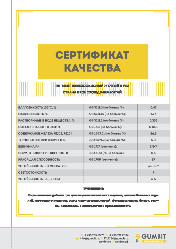 Данный пигмент используется для стабилизации цвета и увеличения светостойкости синего пигмента в резиновых покрытиях. Также данный пигмент может использоваться для расширения цветовой гаммы покрытий